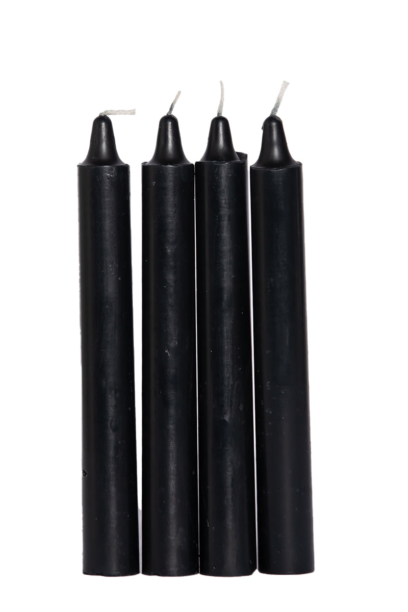 Perfect for titillating BDSM fun! This four-pack of black candles are made of 100% paraffin wax that have just a tinge of heat when dipped, and then quickly warm to the touch. An easy way to safely experiment with wax play.